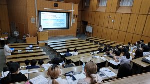 ご講演の後、ご講演いただいた広島県庁の方と、環境科学コース所属教員と、学生で、「環境問題とは?」や、「生命科学と環境科学の関係とは?」などについてディスカッションを行いました。