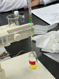 様々な試料に“どのような物質が”、”どれくらい入っているのか”を調べる機器として高速液体クロマトグラフ質量分析計やガスクロマトグラフ質量分析計などの高性能な分析機器があります。3年生以降の実験や卒業研究では、これらの機器を使って環境試料の分析をしますが、ここではその原理となるクロマトグラフィーについて学んでいます。